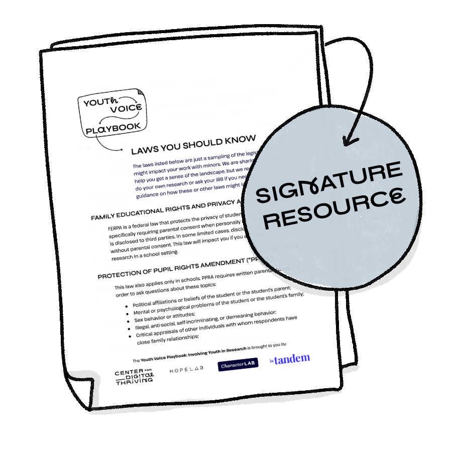 Even if your project isn’t formal research and doesn’t meet the criteria for IRB review, there are still important legal and youth protection criteria to consider. You may need to develop an organizational policy on this, or find a trusted partner to outsource this work to. For example, as we were creating this playbook, we shared a draft with our colleagues at Young Futures who were getting ready to engage youth in their work. Young Futures is a non-academic, non-profit entity; their policies are informed and governed by their fiscal sponsor. In this case, their team needed a new, specialized policy to address legal considerations, risks, and youth protection. Their legal counsel took into account data privacy laws (specifically COPPA & CCPA) and minor labor laws (given that they wanted to compensate participants). Some key laws (e.g., about video recording youth participants) also varied by state.