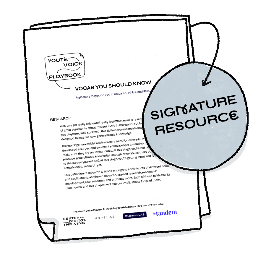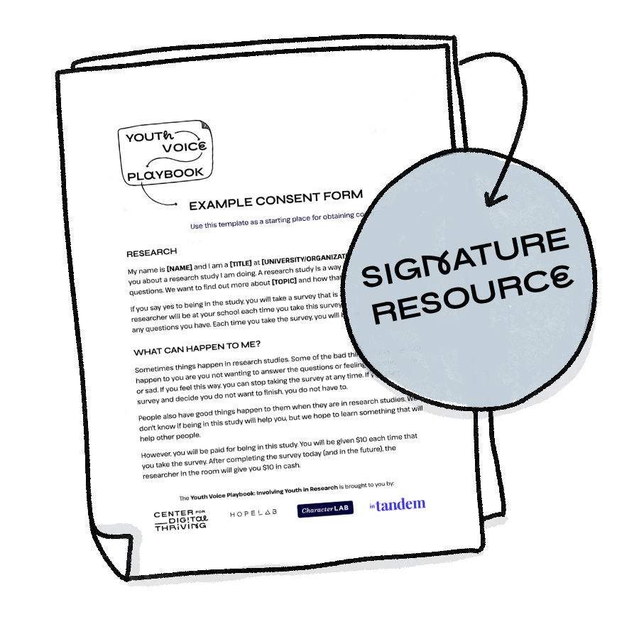 At this point, you might be feeling overwhelmed by the many legal, ethical, and logistical pieces of doing this sort of work with young people. We hear you – it is a lot to figure out! But you’re not alone in figuring it out. You can also always partner with an organization like In Tandem that can help handle logistics like IRB, consent/assent, student safety and privacy, and more. You can also find more localized organizations like university youth research councils that have done this legwork before and can serve as a guide for you along the way. Ultimately, the heavy things in this chapter will help you prepare for scenarios that are hopefully very unlikely – but by preparing for them in advance, you’ll be equipped to care well for youth who may really need support.