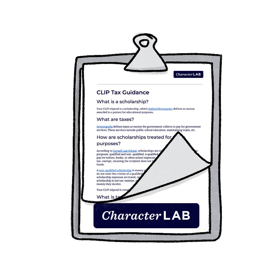Taxes are scary, especially to young people! Character Lab developed this document to help provide some general guidance to participants in our CLIP program, so that they would be able to make informed decisions about how to handle their stipend payments. This is not formal legal or financial advice, but we’ve found it helps them ask the right questions.