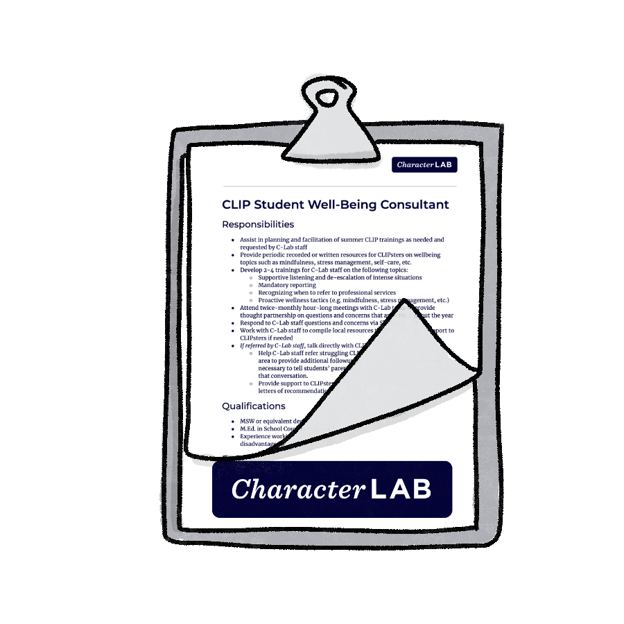 This document from Character Lab’s CLIP program outlines the scope of work for a part-time consultant we brought on to the team to ensure we could support students effectively. Feel free to use it as a starting point for your own hiring of professional staff.