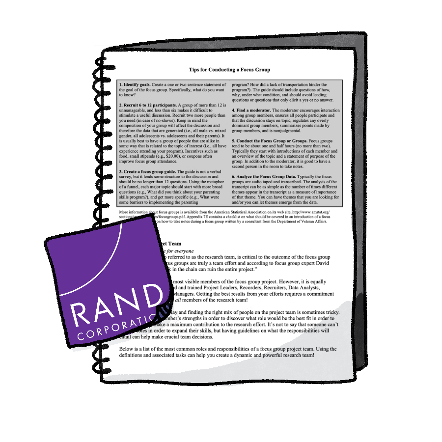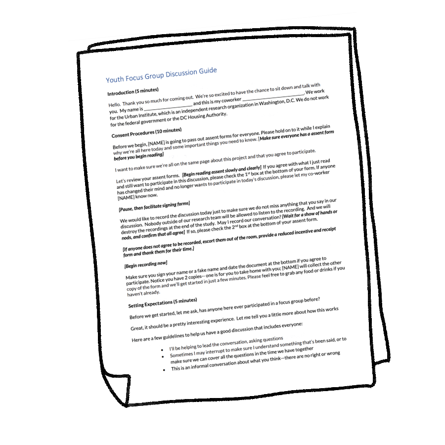 Sometimes it’s helpful to have a detailed facilitation script, especially if you’re leading a focus group. This example from Urban Institute shows how to set the tone, collect informed consent/assent, and guide youth through various topics.