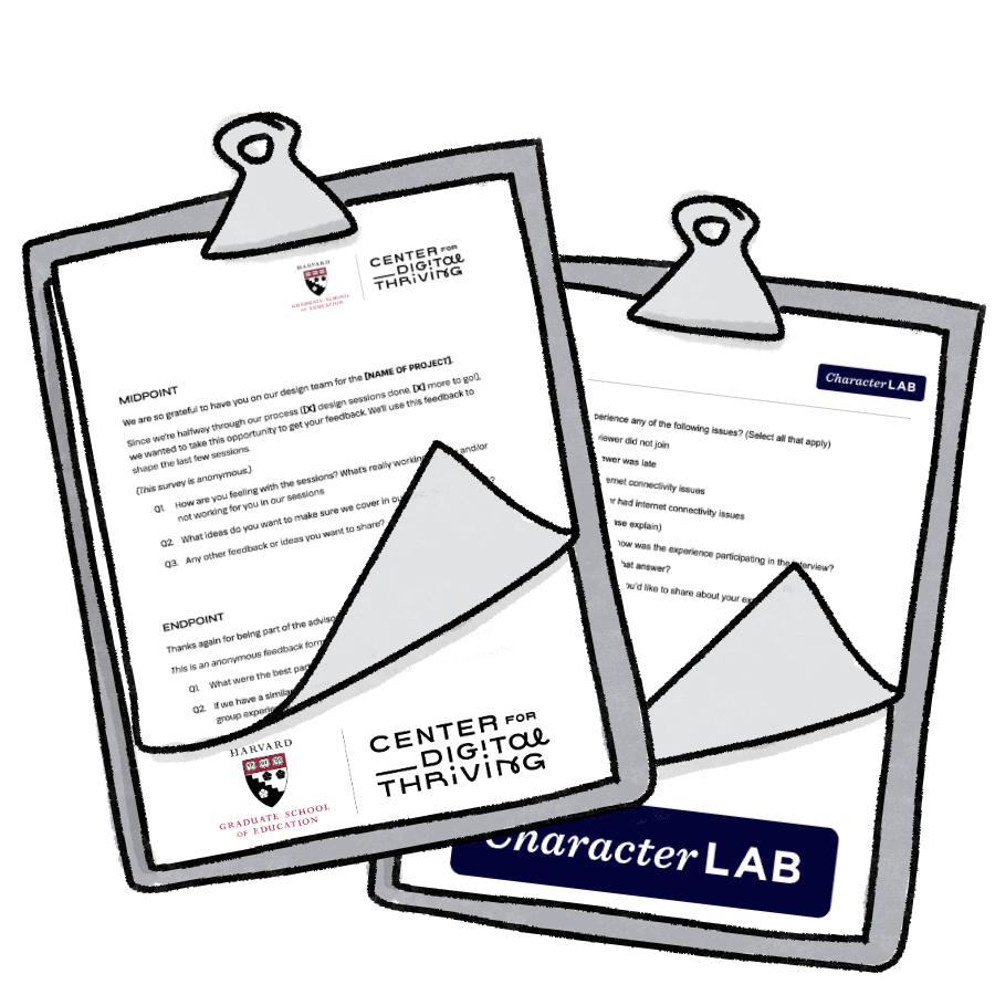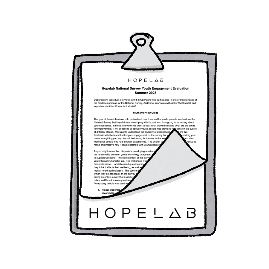Here’s an example interview guide that Hopelab used to get feedback from youth who participated in a series of engagements to develop a national survey. This feedback was collected after the survey development portion of the project was completed.